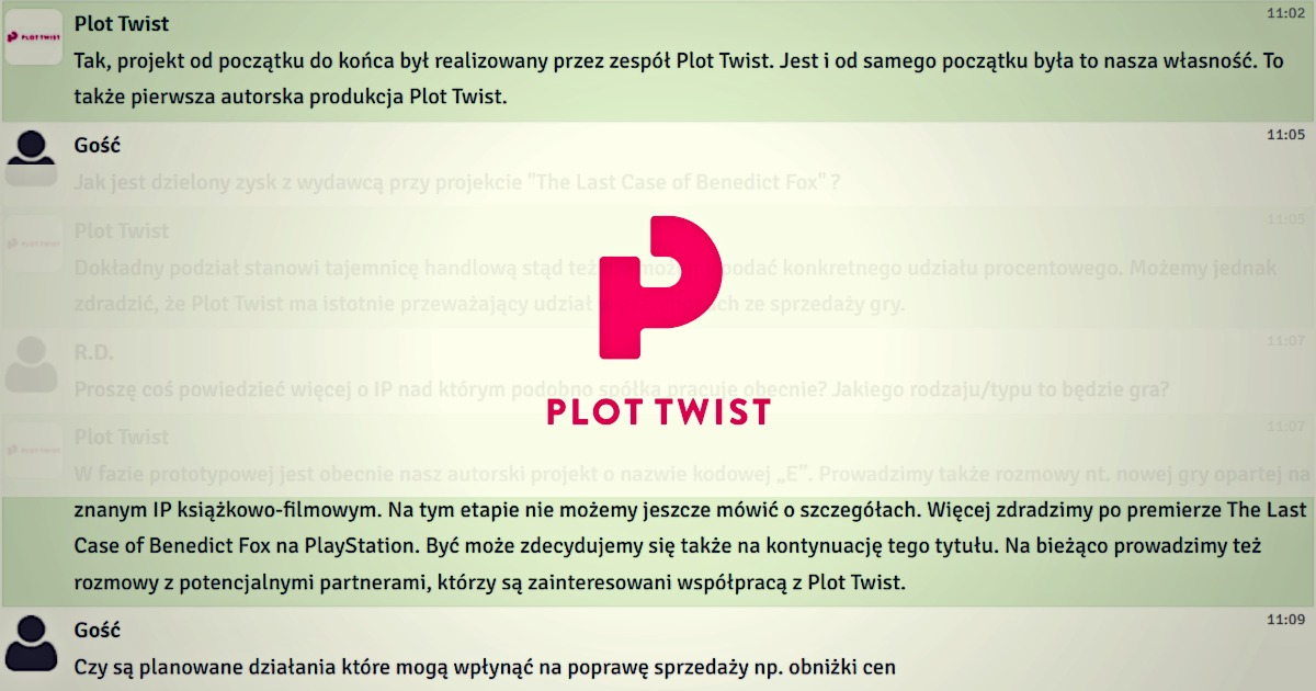 W czwartek 28 września 2023 r. odbył się czat inwestorski z przedstawicielami Plot Twist. Podczas spotkania rozmawialiśmy o planach po debiucie na rynku NewConnect. Inwestorzy zadawali również pytania o dalszy rozwój gry The Last Case of Benedict Fox oraz kolejnych produkcjach.