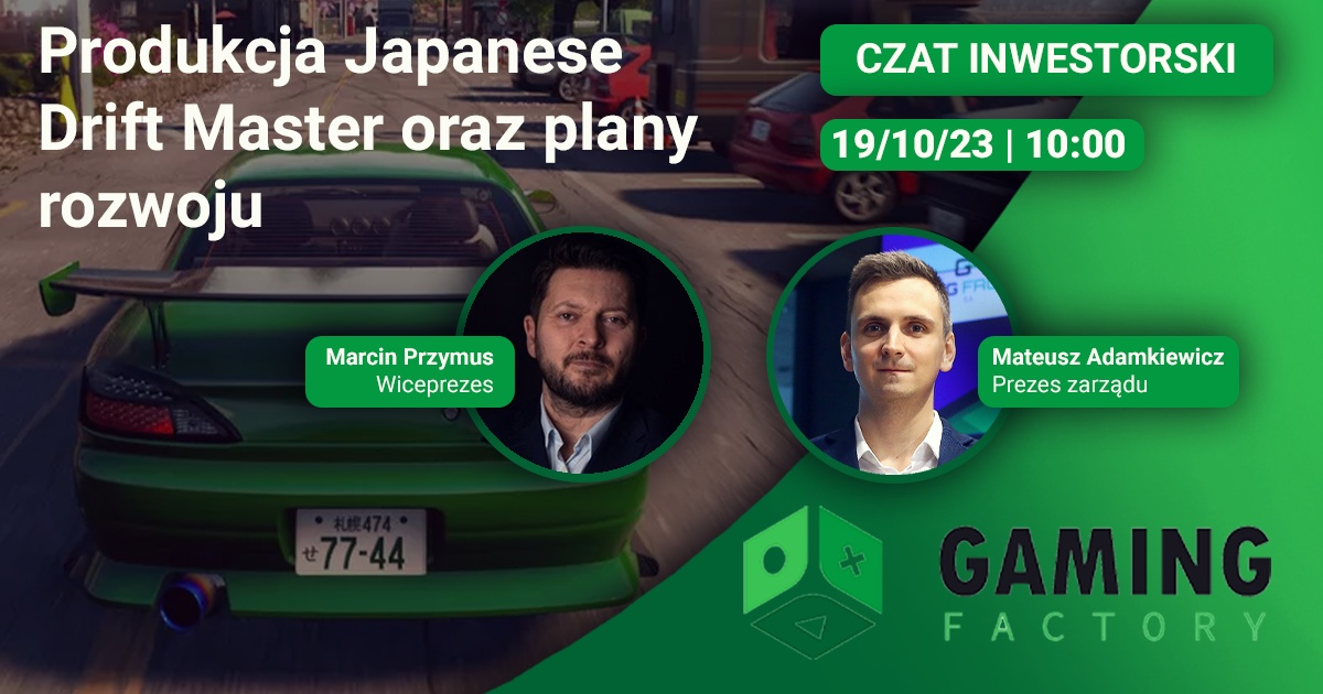 W czwartek, 19 października 2023 roku o godz. 10:00 zapraszamy na czat inwestorski z prezesem zarządu Gaming Factory, Mateuszem Adamkiewiczem oraz wiceprezesem zarządu, Marcinem Przymusem. Podczas spotkania zostaną omówione szczegóły produkcji Japanese Drift Master oraz plany rozwoju. Możliwość zadawania pytań została już uruchomiona.