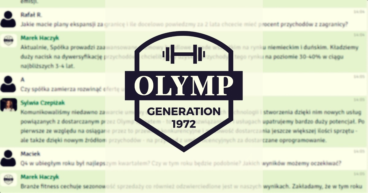W czwartek 19 października 2023 r. odbył się czat inwestorski z prezes zarządu Olymp, Sylwią Czepiżak oraz Markiem Haczykiem, dyrektorem do spraw rozwoju. Podczas spotkania rozmawialiśmy o trwającej emisji akcji. Inwestorzy zadawali również pytania o ekspansję zagraniczną oraz wyzwania biznesowe.