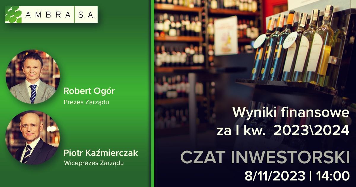 Przy okazji publikacji wyników finansowych za I kwartał 2023/2024 grupa AMBRA zaprasza na czat z prezesem zarządu, Robertem Ogórem oraz wiceprezesem zarządu, Piotrem Kaźmierczakiem. Spotkanie odbędzie się w środę, 8 listopada 2023 r. o godz. 14:00.