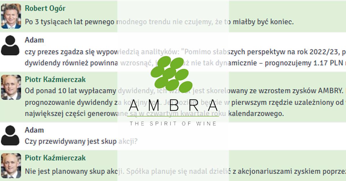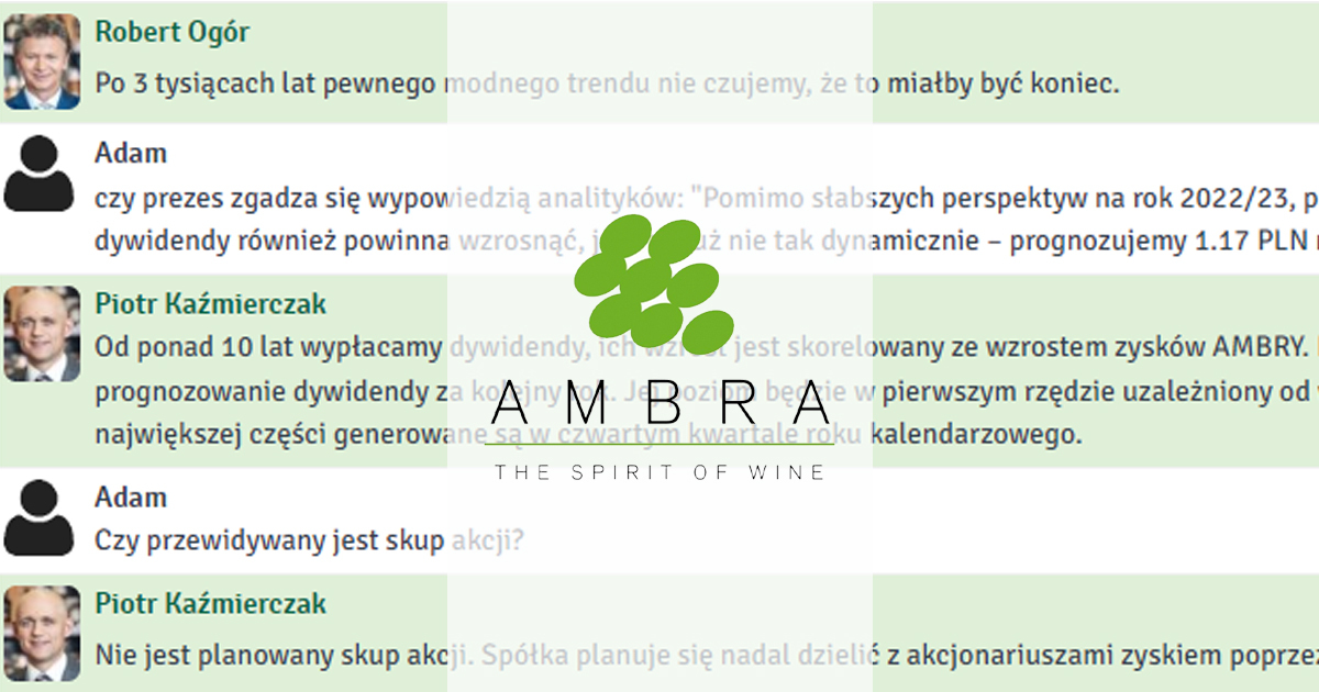W środę, 8 listopada 2023 r. odbył się czat inwestorski z zarządem Grupy Ambra. W spotkaniu udział wzięli Robert Ogór, prezes zarządu oraz Piotr Kaźmierczak, wiceprezes zarządu. Tematem przewodnim spotkania były wyniki finansowe spółki za I kwartał 2023/2024 roku.