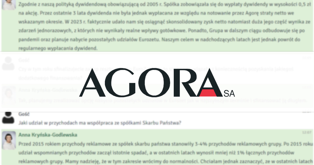 "Naszym celem w nadchodzących latach jest powrót do regularnego wypłacania dywidend" - relacja z czatu z CFO Agora S.A.