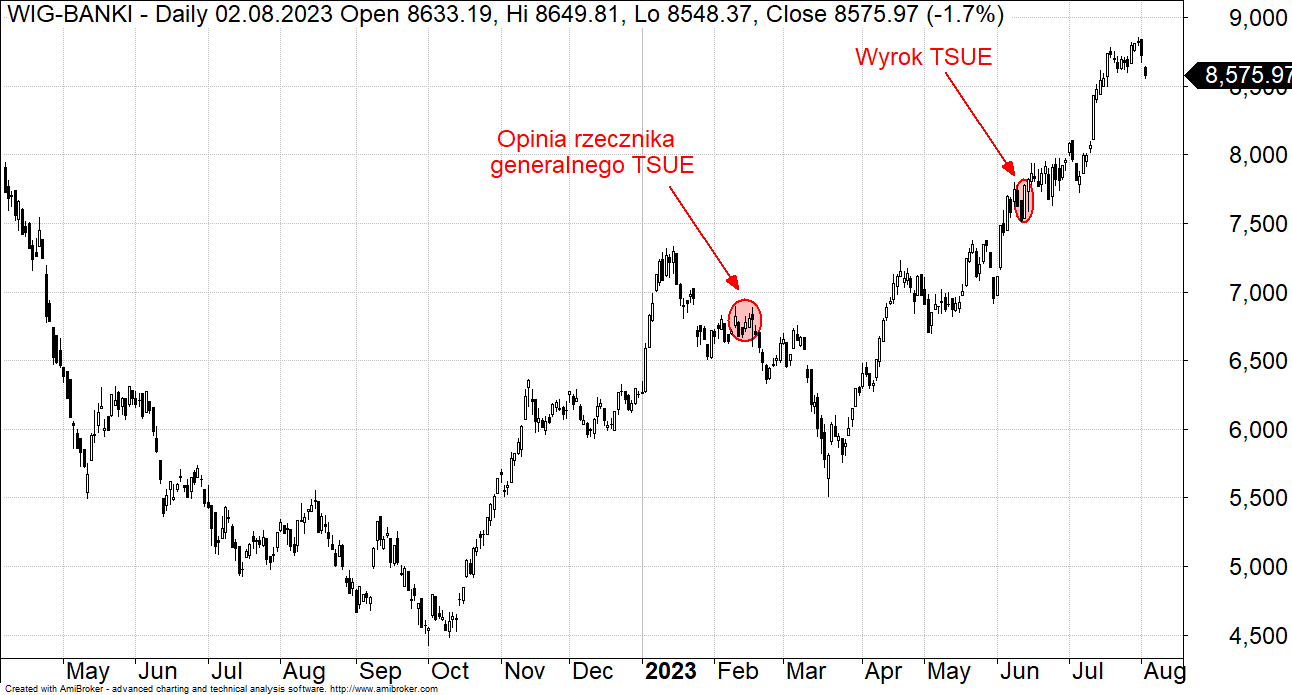 Wyrok TSUE, który zapadł w połowie czerwca, był już wyceniany przez rynek od dłuższego czasu. Wynika to z faktu, że w lutym br. rzecznik generalny TSUE już zajął stanowisko w sprawie dodatkowych roszczeń banków od konsumentów. Dlatego też negatywny wyrok TSUE dla banków wiązał się ze zwiększeniem rezerw na ryzyko kredytów walutowych.