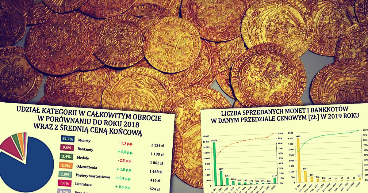 17 domów aukcyjnych sprzedało w 2019 roku 46,3 tys. przedmiotów, takich jak monety czy banknoty kolekcjonerskie. Liczba sprzedanych obiektów urosła rok do roku o 16 tys. Tak wynika z raportu „PODSUMOWANIE RYNKU NUMIZMATYCZNEGO W 2019 ROKU” autorstwa Jakuba Grzyba ze Szkoły Głównej Handlowej, który jest pasjonatem numizmatyki. Raport powstał na zamówienie Gabinetu Numizmatycznego Damian Marciniak.