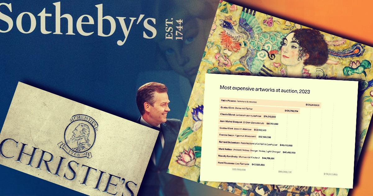 W 2023 r. roku tylko dwa dzieła sztuki zostały sprzedane za więcej niż 100 mln dolarów, były to „Femme à la montre” Pabla Picassa oraz „Dame mit Fächer” Gustava Klimta.