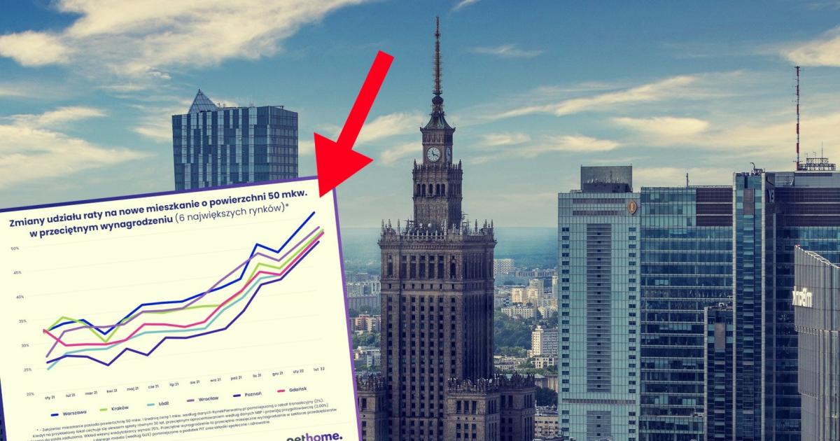 Na danych przedstawionych przez RynekPierwotny.pl i GetHome.pl, udział raty kredytu na średniej wielkości mieszkanie w przeciętnym wynagrodzeniu wynosi już 51% w Warszawie, powyżej 45% znajdują się również Wrocław, Kraków i Gdańsk, Poznań jest niewiele poniżej tego wyniku.