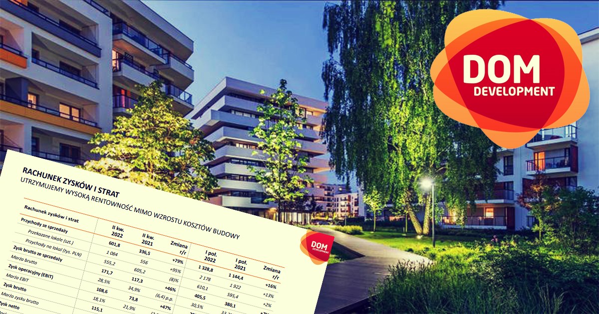Dom Development w I półroczu br. kontynuował swoją ekspansję na rynku krakowskim, obejmując 100% udziałów w spółkach Sento i BUMA. Pod koniec czerwca spółka uchwaliła rekordową dywidendę w kwocie 10,50 zł za akcję.