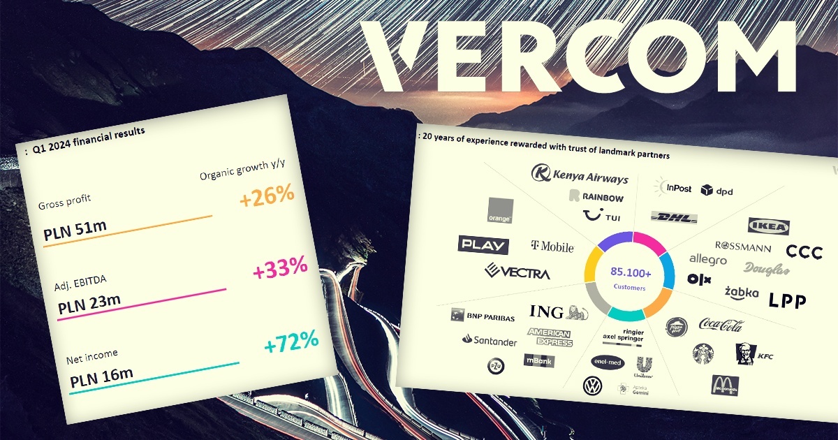 W pierwszym kwartale 2024 roku Vercom osiągnął znaczące wzrosty wyników finansowych. Jak podkreślił Krzysztof Szyszka, prezes zarządu Vercom, był to bardzo dobry okres, z "bardzo zdrowym, organicznym wzrostem". Zysk brutto wyniósł 50,6 mln zł, co oznacza wzrost o 25,7% rok do roku. Wynik EBITDA również wzrósł o 33%, a zysk netto osiągnął rekordowy poziom.