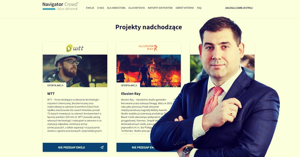 Artur Granicki CEO Navigator Crowd: Jako Navigator zapewniliśmy w do tej pory finansowanie ponad 145 podmiotom o wartości około 4,5 mld zł. To były głównie oferty IPO i pre-IPO. W tym się specjalizujemy od lat, ale zauważyliśmy, że od jakiegoś czasu przychodzą do nas spółki, które poszukują finansowania, chociaż nie są jeszcze w pełni gotowe na debiut giełdowy. W wielu przypadkach to są bardzo ciekawe, perspektywiczne i poukładane podmioty, ale mimo to musieliśmy im odmawiać, właśnie ze względu na perspektywę inwestycyjną naszych inwestorów, czyli zbyt długi okres od oferty do IPO. Navigator Crowd będzie dla takich spółek, które są ciekawe, ale ich perspektywa na debiut na giełdzie to 1-2, maksymalnie 3 lata. Oczywiście czasami do debiutu może dojść jeszcze szybciej. Przykładowo pierwsza spółka, dla której przeprowadzamy kampanię, czyli Wired Fish, zadebiutuje na NewConnect jeszcze w tym roku. Docelowo idea jest jednak taka, żeby ta perspektywa inwestycyjna była nieco dłuższa.