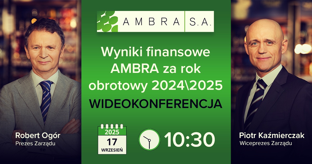 W środę, 17 września 2025 r.  odbyła się wideokonferencja z zarządem Grupy AMBRA: prezesem zarządu, Robertem Ogórem oraz wiceprezesem zarządu, Piotrem Kaźmierczakiem. Spotkanie było poświęcone omówieniu wyników finansowych za rok obrotowy 2024/2025, bieżącej sytuacji oraz planów spółki. Zapraszamy do wysłuchania prezentacji spółki oraz sesji pytań i odpowiedzi.
