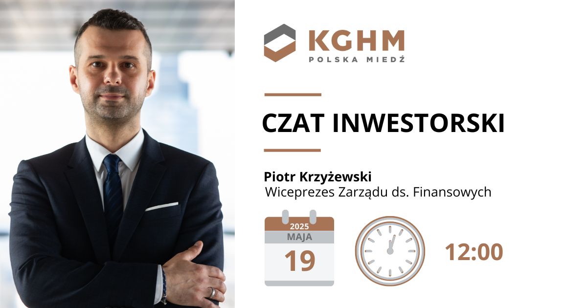 W poniedziałek, 19 maja 2025 roku odbył się czat inwestorski z Piotrem Krzyżewskim, Wiceprezesem KGHM S.A. Zarządu ds. Finansowych. Spotkanie było poświęcone omówieniu wyników finansowych spółki za I kwartał 2025 roku. Zapraszamy do zapoznania się z relacją z tego wydarzenia.