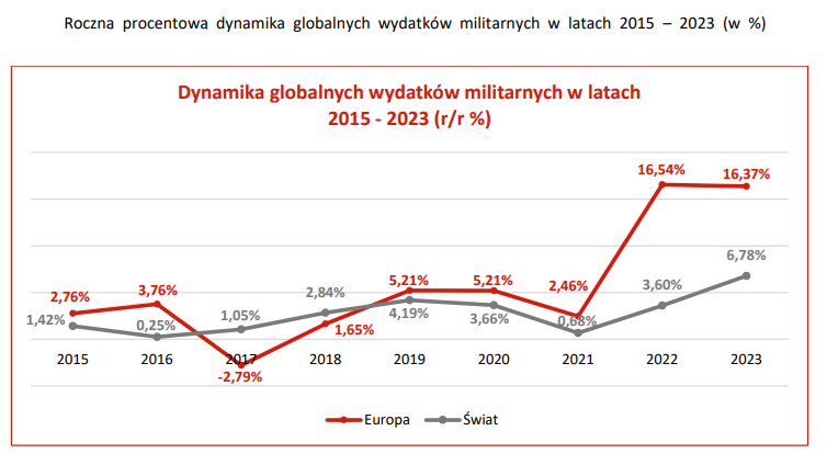 Dodatkowym czynnikiem sprzyjającym spółce są stale rosnące globalne wydatki militarne. Jak wynika z danych SIPRI, w 2023 roku osiągnęły one poziom 2 393,6 mld USD, co oznacza wzrost o 6,78% względem roku poprzedniego. W Europie wzrost ten był jeszcze bardziej wyraźny – 16,37% rok do roku, a łączna wartość wydatków wyniosła 569,1 mld USD. Udział państw europejskich w globalnych wydatkach militarnych wzrósł w 2023 roku do 23,78%.