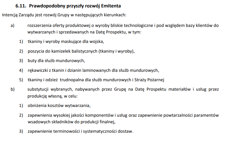 „Przychody grupy w ostatnich latach pozostają pod pozytywnym wpływem sytuacji geopolitycznej, która silnie kształtuje popyt na wyposażenie służb mundurowych. Rośnie poziom nakładów przeznaczanych z budżetu państwa na obronność i bezpieczeństwo kraju, które w konsekwencji przekładają się bezpośrednio także na wydatki na specjalistyczną odzież ochronną i elementy wyposażenia osobistego dla służb mundurowych – mówi prezes zarządu, Andrzej Tabaczyński.