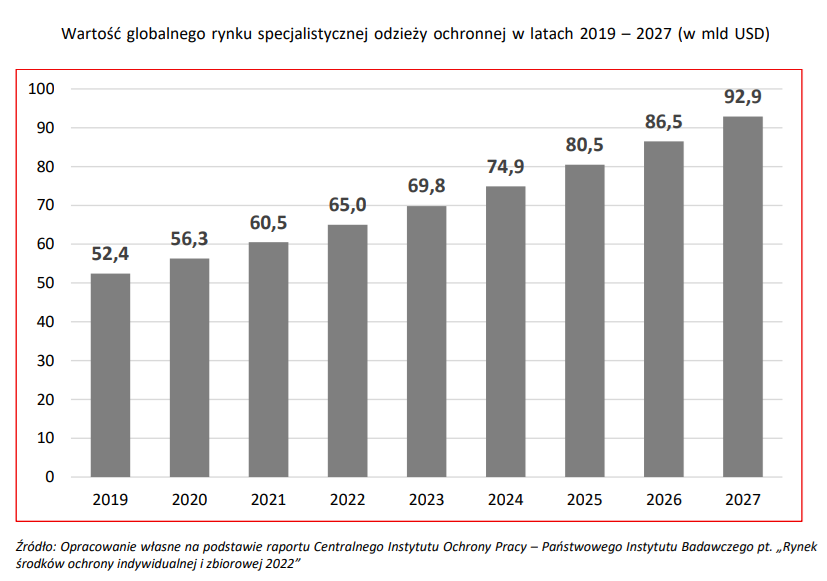 Z drugiej strony, globalny rynek specjalistycznej odzieży ochronnej i elementów wyposażenia osobistego znajduje się w fazie dynamicznego wzrostu. Według raportu Centralnego Instytutu Ochrony Pracy – Państwowego Instytutu Badawczego, jego wartość ma wzrosnąć z 52,4 mld USD w 2019 roku do prognozowanych 92,9 mld USD w roku 2027. Oznacza to łączny wzrost o 77,1%, przy skumulowanym rocznym wskaźniku wzrostu (CAGR) wynoszącym 7,4%.