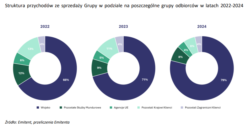 Kolejnym istotnym zagrożeniem jest silne uzależnienie Grupy od współpracy z jednostkami wojskowymi Skarbu Państwa, w szczególności z 3 i 4 Regionalną Bazą Logistyczną. W 2024 roku tylko współpraca z 3 Regionalną Bazą Logistyczną odpowiadała za 40,4% całkowitych przychodów Grupy, a z 4 Bazą za 17,2%. Tak duża koncentracja przychodów wiąże się z ryzykiem istotnego spadku przychodów w przypadku zakończenia współpracy z tymi jednostkami lub jej ograniczenia.