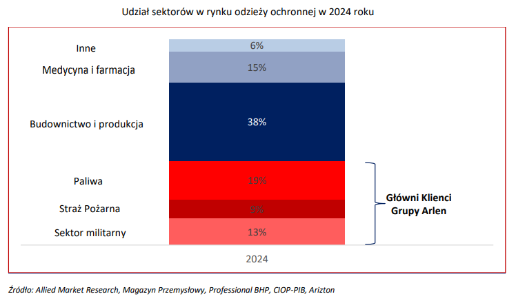 W obrębie tego rynku Grupa Arlen działa w szczególnej niszy – specjalistycznej odzieży ochronnej dla służb mundurowych, takich jak wojsko, Straż Graniczna, policja, służby specjalne, celno-skarbowe i pożarnicze. Spółka dostarcza także produkty dla przemysłu paliwowego, którego udział w wyżej przedstawionym rynku wynosi 19%. Dla sektora militarnego udział ten wynosi 13%, a dla straży pożarnej 9%. Tak więc sub-segment rynku, w którym działa Arlen stanowi łącznie 41%.