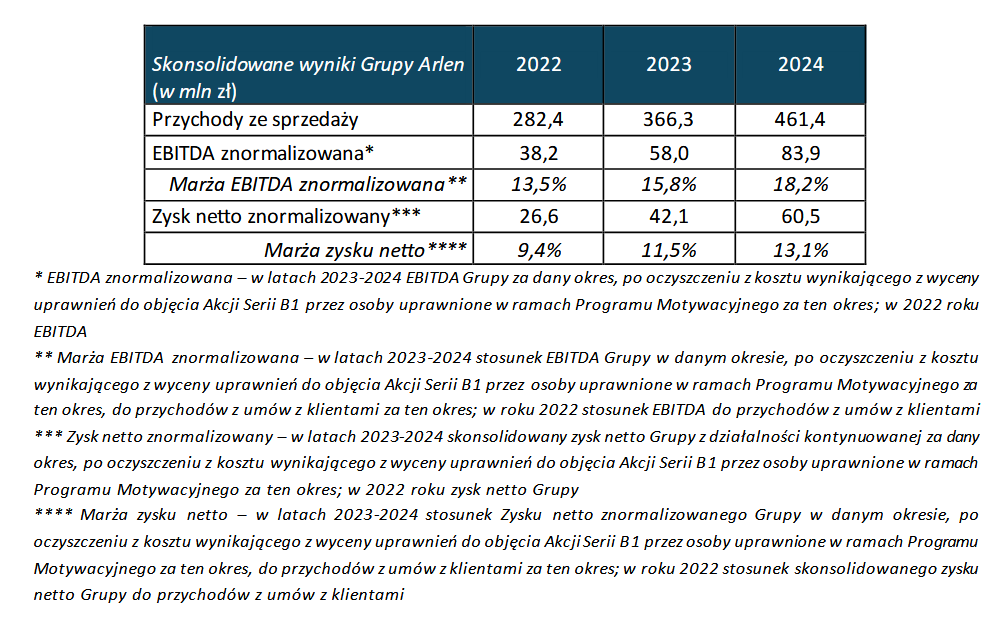 „Decyzja o przeprowadzeniu oferty publicznej oraz ubieganiu się o dopuszczenie i wprowadzenie akcji spółki do obrotu na GPW w Warszawie wyznacza kolejny istotny etap rozwoju grupy. W ostatnich latach konsekwentnie budowaliśmy pozycję firmy jako wiodącego na rynku polskim oraz jednego z kilku wiodących w Europie gracza na rynku specjalistycznej odzieży ochronnej dla służb mundurowych w kraju i za granicą z unikatową przewagą konkurencyjną firmy zintegrowanej pionowo z szeroką bazą produkcyjną w kraju. W latach 2022-2024 grupa wygenerowała dwucyfrowe wzrosty przychodów i zysków oraz rosnące marże, a także solidną pozycję gotówkową” stwierdził Andrzej Tabaczyński, prezes i główny akcjonariusz Arlenu. Więcej szczegółów na temat oferty poznamy po publikacji prospektu, który czeka na zatwierdzenie przez KNF.