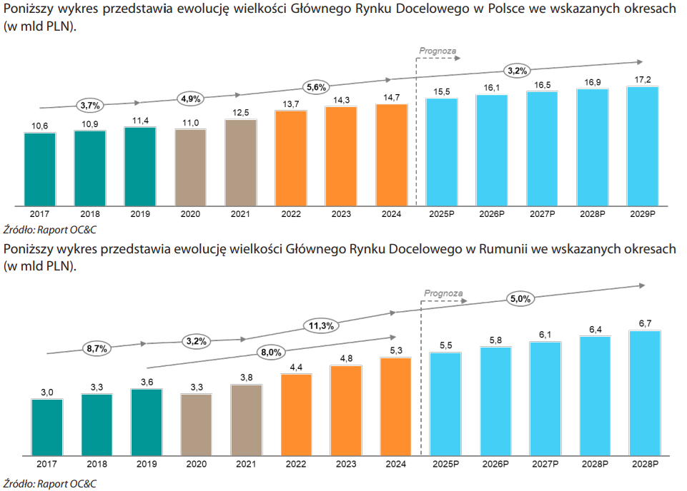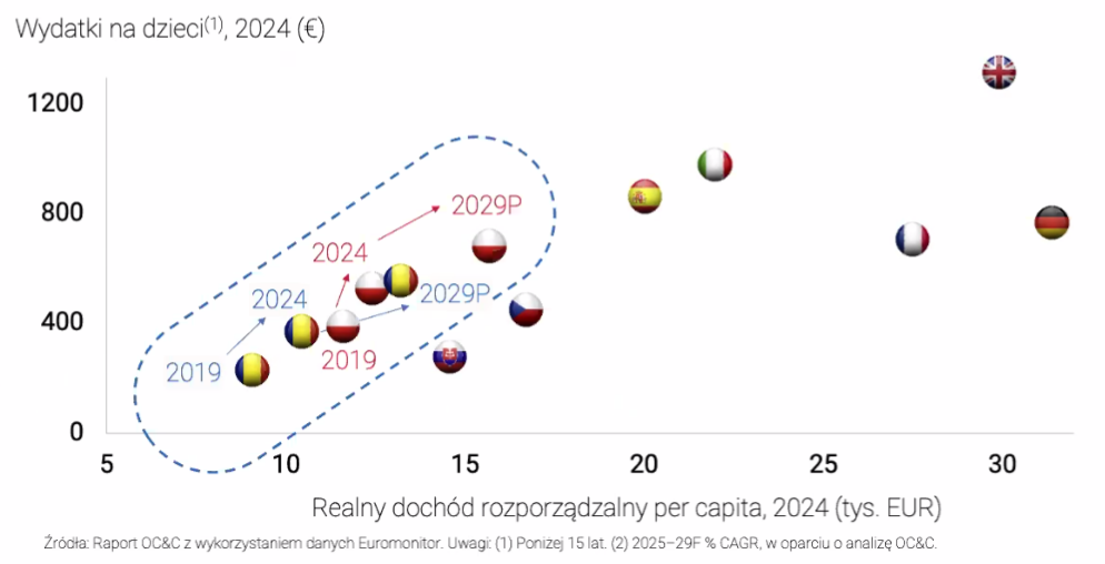 Rumunia oferuje jeszcze wyższą dynamikę. Historycznie rynek rósł tam szybciej niż w Polsce, a w latach 2025–2029 prognozowany jest wzrost o około 5,0% CAGR, napędzany silniejszym wzrostem realnych dochodów rozporządzalnych i rosnącymi wydatkami na dziecko pomimo słabszej demografii.