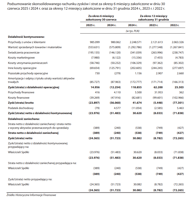 W I półroczu 2025 r. przychody wyniosły ok. 985,1 mln zł (+0,5% r/r), zysk operacyjny sięgnął ok. 15 mln zł wobec straty rok wcześniej, a skorygowana EBITDA wzrosła do ok. 105,3 mln zł (+26,9% r/r);