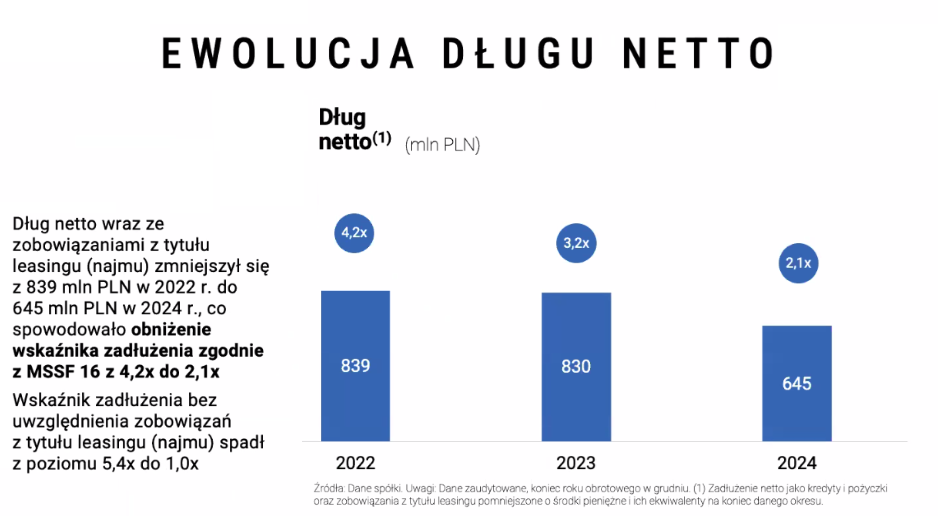 Spółka zamierza pozyskać około 150 mln zł brutto z nowej emisji, by wzmocnić bilans i przyspieszyć rozwój. Około 70–90% wpływów ma zostać przeznaczone na częściową spłatę zadłużenia, co, według zapewnień zarządu, obniży wskaźnik zadłużenie netto / skorygowana EBITDA do ok. 1,6x i zmniejszy koszty finansowe o szacunkowe 12–15 mln zł rocznie od 2026 r., poprawiając przepływy pieniężne.