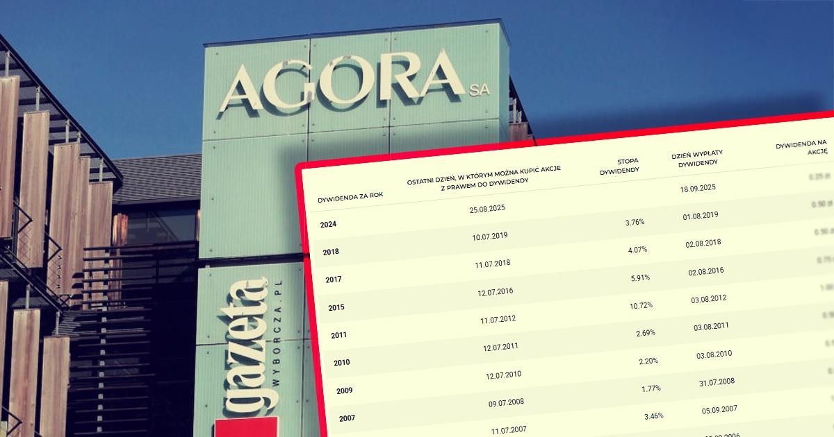 Agora była przez wiele lat uważana za spółkę dywidendową, choć wypłacała je z przerwami. Ostatnia wypłata w 2019 r. wyniosła 0,50 zł na akcję. Przez kolejne pięć lat – od 2020 r. do 2024 r. – dywidendy nie były wypłacane. Powodem były zarówno gorsze wyniki finansowe, jak i niepewność związana z procesami restrukturyzacyjnymi.