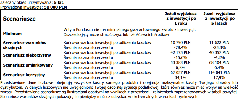 Po 1 lipca 2026 r. opłata za zarządzanie ma wynieść 0,5% rocznie, a pozostałe koszty są limitowane do 0,4%, a to implikuje docelowy całkowity wskaźnik kosztów w przedziale 0,5–0,9% zależnie od aktywów. W praktyce zalecany jest minimalny horyzont utrzymania środków w funduszu na minimum 5 lat, ale wykup certyfikatów możliwy jest każdego dnia sesyjnego zgodnie ze statutem, czyli zainwestowane środki nie są blokowane, a wręcz łatwiejsze do upłynnienia niż większość innych rodzajów lokat kapitału.