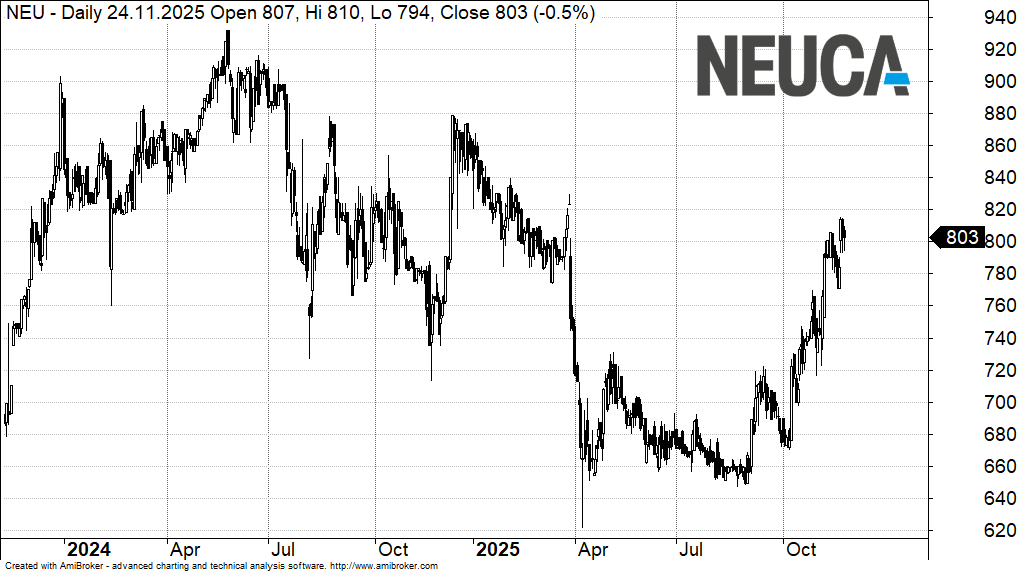 Od początku roku kurs akcji Grupy Neuca utrzymuje się 5% poniżej otwarcia, ale od sierpniowych dołków wzrósł już o ponad 25%. Notowania zareagowały pozytywnie na publikację wyników, co przełożyło się na wzrost kursu spółki.