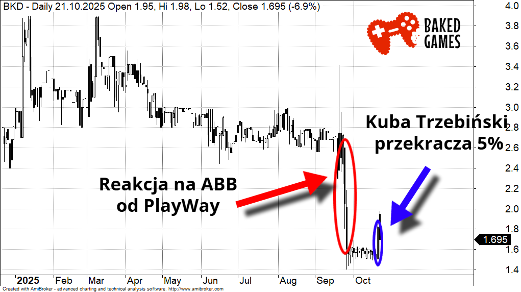 Potwierdzać zdają się to komunikaty, na poniedziałkowej sesji pojawił się komunikat ESPI w którym 5% w akcjonariacie Baked Games przekroczył Kuba Trzebiński wiceprezes PlayWay.
