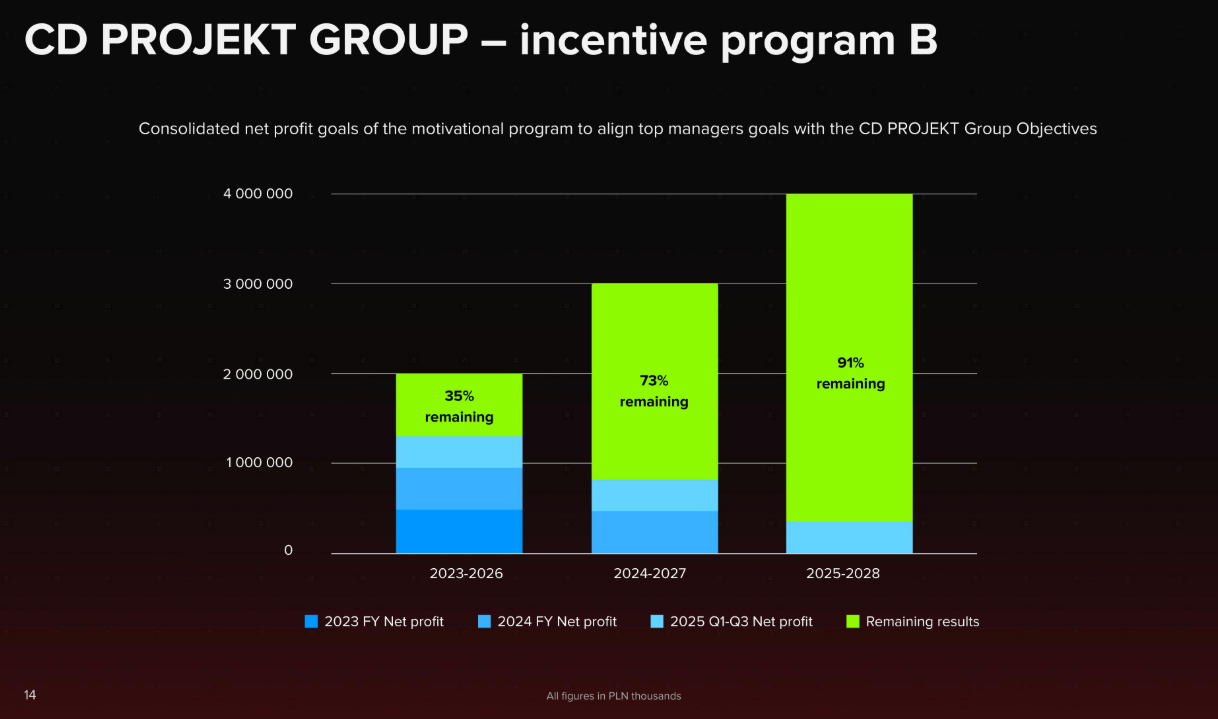 “Warunek programu motywacyjnego dotyczący wyników finansowych na lata 2023–2026 został ustalony na poziomie 2 mld zł skumulowanego zysku netto. Po 11 z 16 kwartałów do osiągnięcia tego celu pozostaje jeszcze 700 mln zł. Chociaż jest to bardzo ambitny cel, uważamy, że jeśli wszystko pójdzie zgodnie z naszym planem, mamy spore szanse na jego osiągnięcie. Biorąc pod uwagę nasze obecne postępy istnieje szansa, że nowe treści, o których wspomniano w ostatnich rozmowach i raportach, zostaną opublikowane w nadchodzącym roku, co będzie miało wpływ na nasze wyniki i zwiększy prawdopodobieństwo osiągnięcia warunku dotyczącego zysków dla pierwszego etapu programu motywacyjnego” - powiedział Nielubowicz podczas videokonferencji wynikowej.