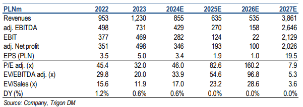 Jak już wspomnieliśmy, cele ustanawiane w ramach programu motywacyjnego mogą być znaczącą podpowiedzią w ustaleniu kalendarza premier studia. Przed rokiem pisaliśmy o tym, że zamiar wypracowania 2 mld zł zysku netto w latach 2023-2026 będzie możliwy do wykonania jedynie w momencie premiery kolejnej gry z serii Wiedźmina. Co ciekawe, w ostatniej rekomendacji analityk Trigon DM i jednocześnie były pracownik CD Projektu Grzegorz Balcerski spodziewa się, że rynkowy debiut kolejnego tytułu nastąpi w 2027 r. Sugestia ta zawarta jest w szacunkach wyników studia w następnych latach.