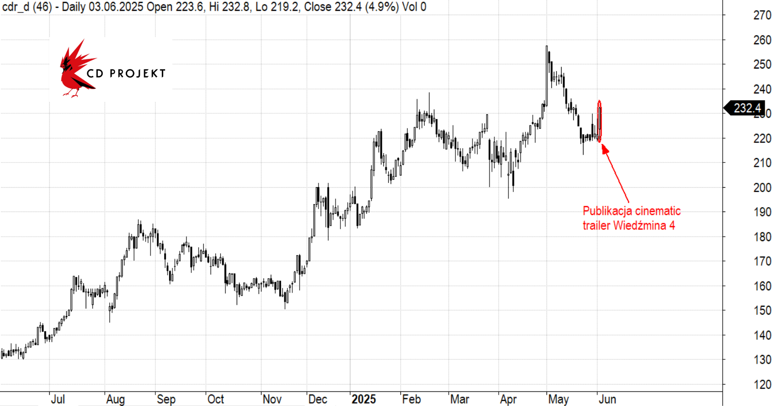 Studio zaprezentowało trailer oraz technologiczne demo Wiedźmina 4. We wtorek po południu cena akcji rośnie o ponad 6%, najmocniej spośród spółek WIG20.