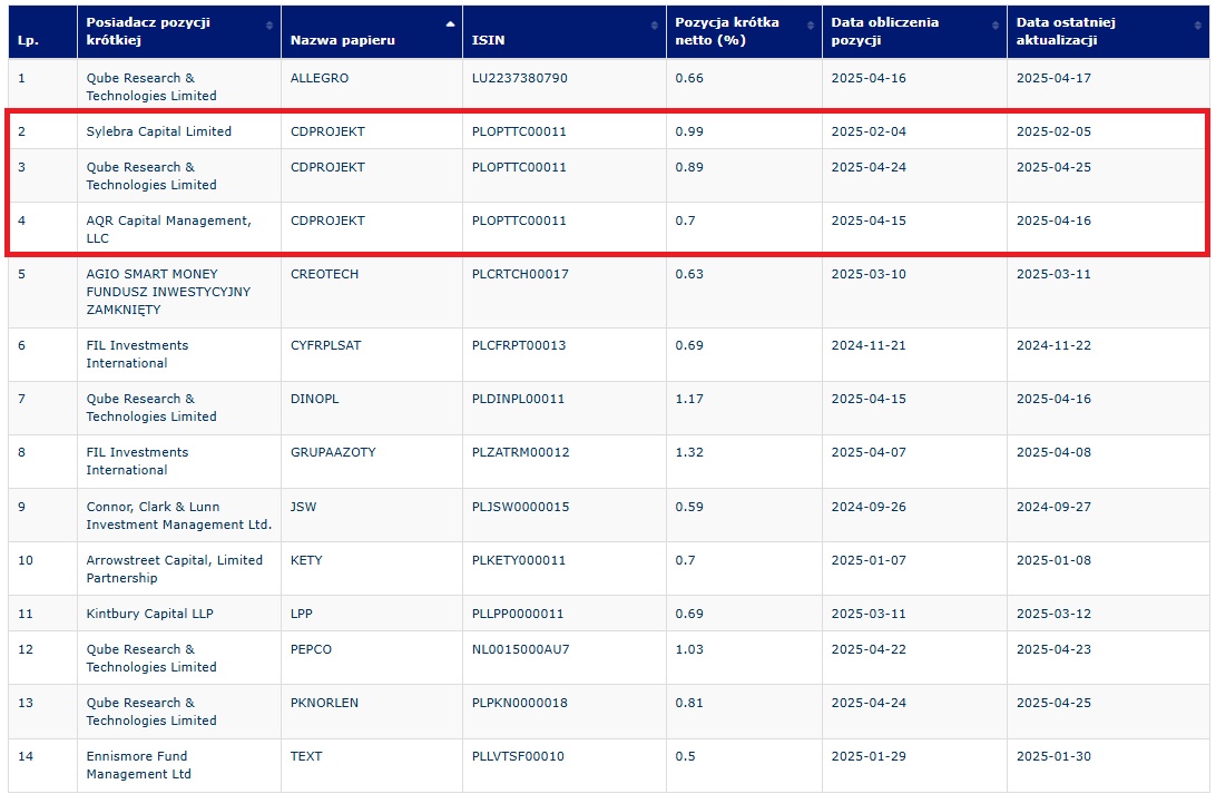 Jednocześnie warto zwrócić uwagę na aktualną sytuację w rejestrze krótkich pozycji KNF. 23 kwietnia pod progiem widoczności opiewającym na 0,5% akcji, znalazła się krótka pozycja funduszu Marshall Wace dotycząca akcji CD Projektu. Aktualnie w rejestrze widnieją 3 transakcje związane z walorami spółki.