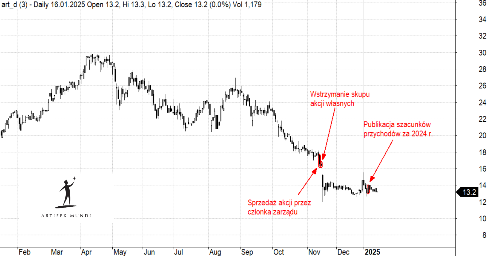„Co do zasady nie komentujemy, jako zarząd, decyzji inwestycyjnych poszczególnych insiderów. W swoim imieniu mogę jedynie wskazać, że sprzedaż dotyczyła niewielkiego procenta posiadanych akcji. Transakcje były dokonane po okresie zamkniętym (i z tego co mi wiadomo, były planowane od dłuższego czasu)” mówił nam na początku grudnia prezes Artifeksu Mundi Przemysław Błaszczyk.