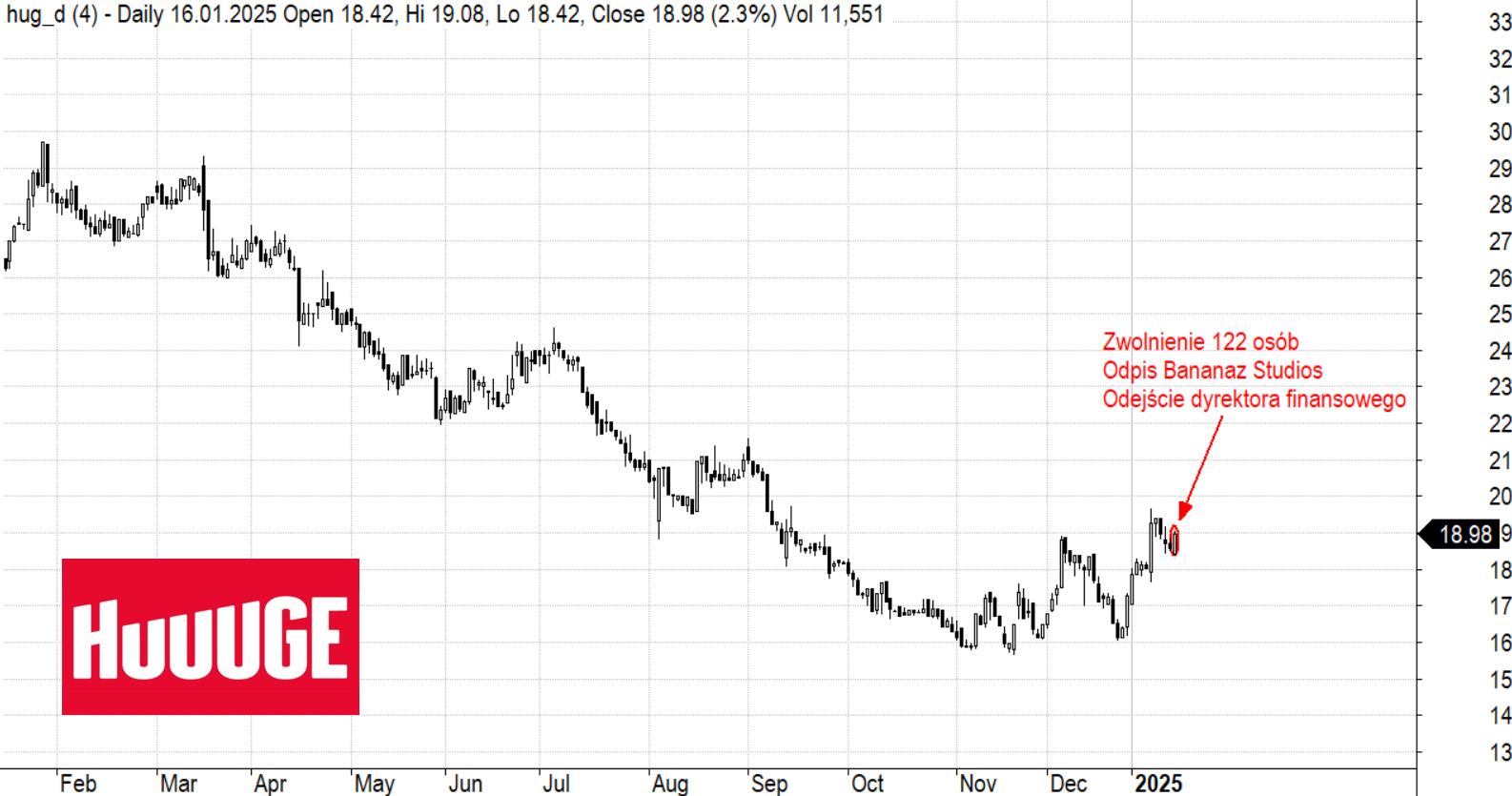 Na początku roku grupa Huuuge ogłosiła redukcję zatrudnienia, która dotknęła łącznie 122 osób, czyli około 29% załogi. Biorąc pod uwagę ogłoszone kilka tygodni temu zwolnienia w PCF Group widać, że restrukturyzacja w branży ciągle trwa. Oprócz tego firma zmuszona była do odpisu wartości Bananaz Studios. W marcu 2024 r. giełdowy podmiot ogłosił inwestycję 3,5 mln dolarów w akcje wspomnianej spółki, z perspektywą zaangażowania kolejnych 2,5 mln dolarów. Ostatecznie inwestycja zostanie odpisana do zera. W tym samym momencie Huuuge ogłosiło znaczące ograniczenie prac zespołów Huuuge Pods, czyli grup odpowiedzialnych za tworzenie zupełnie nowych projektów.