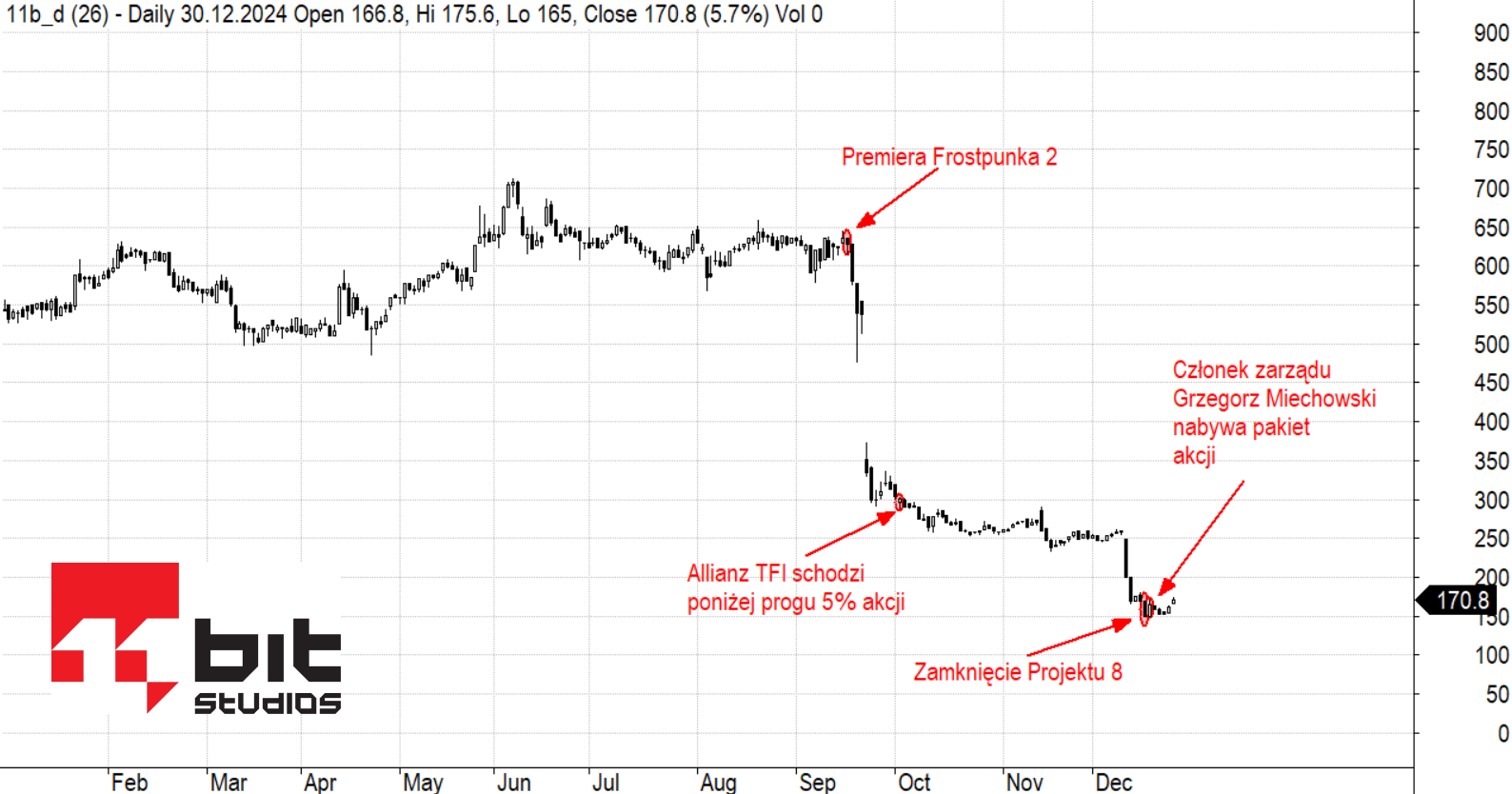 Jak już wspomnieliśmy, premiera Frostpunka 2 nie spełniła oczekiwań rynku. Mimo faktu, że sprzedaż zdaje się być zgodna z przewidywaniami zarządu (do 14 listopada sprzedano ponad 0,5 mln egzemplarzy), wieści o przesunięciu premiery The Alters na 2025 r. oraz rezygnacja z Projektu 8 zdołowały kurs akcji spółki. Od 17 września do końca roku cena waloru firmy spadła o przeszło 70%. Analitycy sądzą, że aktualny rok rodzi szanse na zmianę podejścia inwestorów do spółki.