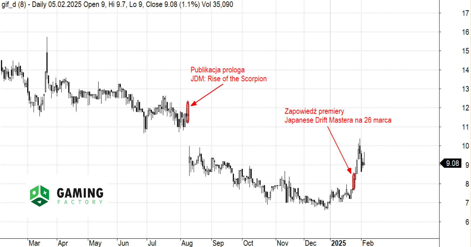 W kontekście ogłoszonych transakcji ciekawie wygląda przypadek Gaming Factory. Fundusz Agio Smart Money FIZ zmniejszył posiadany pakiet z niespełna 15% akcji do niemal 10%. Sprzedaż wynika wyłącznie z kwestii technicznych, a nie braku wiary w nadchodzącą premierę Japanese Drift Mastera.
