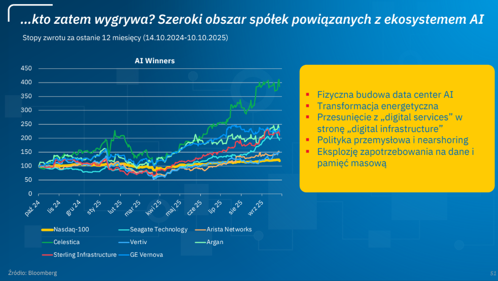 “Szczątkowa ekspozycja na branżę SI w Polsce i niewielka ekspozycja na rynek surowcowy budują w nas przekonanie, że kolejne kwartały na krajowym rynku akcji będą wyzwaniem. Dlaczego? Ponieważ nie wykorzystujemy sprzyjających warunków rynkowych do wzrostów, a rosną nam ryzyka (polityczne i geopolityczne)” - stwierdził Kaźmierczak.