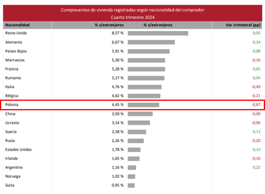 Część z nas, która tak chętnie zamienia Polskę na ciepłą Hiszpanię, równie chętnie kupuje tam nieruchomości. W 2024 r. kupiliśmy ponad 4,2 tys. domów i apartamentów, to o 35 proc. więcej niż w 2023 r. Ten wynik pozwolił nam nam na uplasowanie się w pierwszej dziesiątce zagranicznych nabywców w Hiszpanii (dane z Registradores de España).