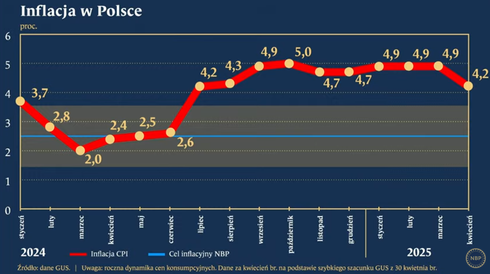 W I kw. 2025 r. dynamika cen okazała się niższa od oczekiwań - o 0,5 pkt proc. mniej niż w projekcji marcowej. Spadek inflacji nastąpił z powodu zmiany koszyka. Obniżyła się też inflacja bazowa, którą byliśmy głównie zainteresowani. Według wstępnych danych za kwiecień, CPI obniżyło się do 4,2 proc.