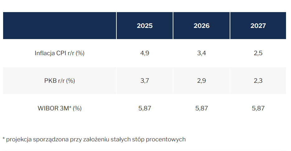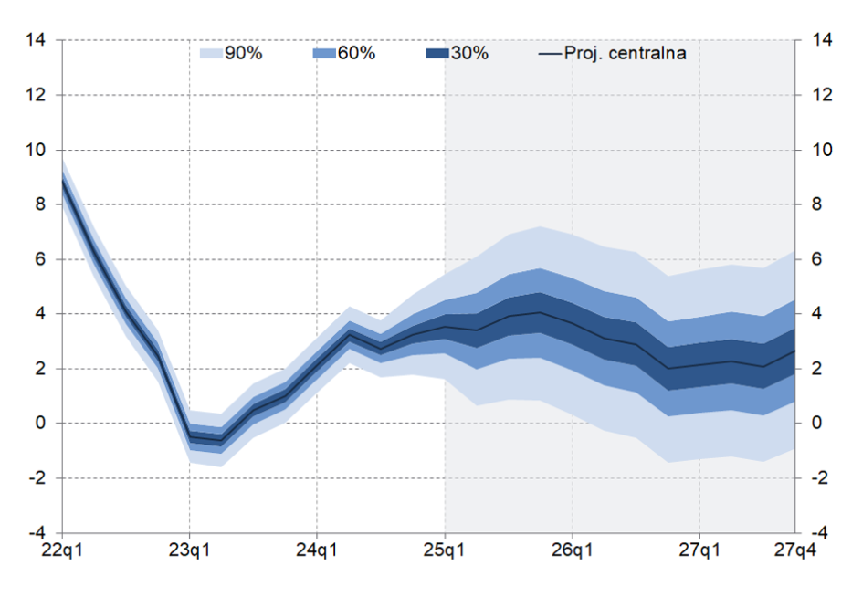 W przypadku inflacji bazowej, w tym roku będzie cały czas oscylować wokół 4 proc., w 2026 r. ma obniżyć się do 3,6 proc., by w 2027 r. osiągnąć 2,8 proc. Duży wpływ na hamowanie inflacji bazowej ma mieć słabnąca dynamika kosztów pracy.