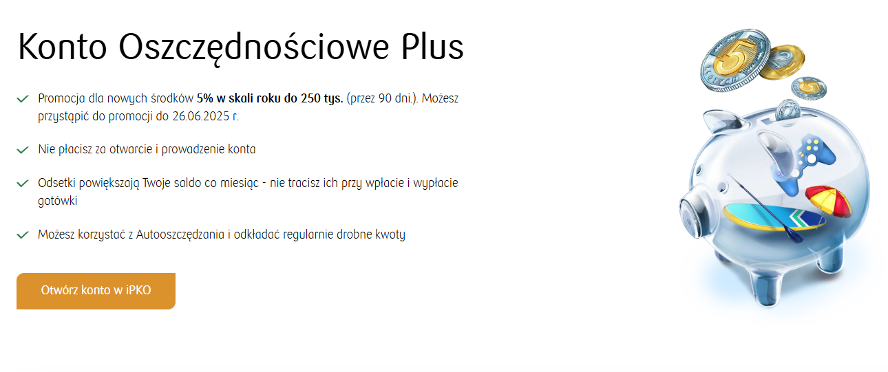 | Konto oszczędnościowe Plus | 5,00% | 90 dni | 250 000,00 zł | Promocja trwa do 26 czerwca 2025 roku. Tylko na nowe środki. |