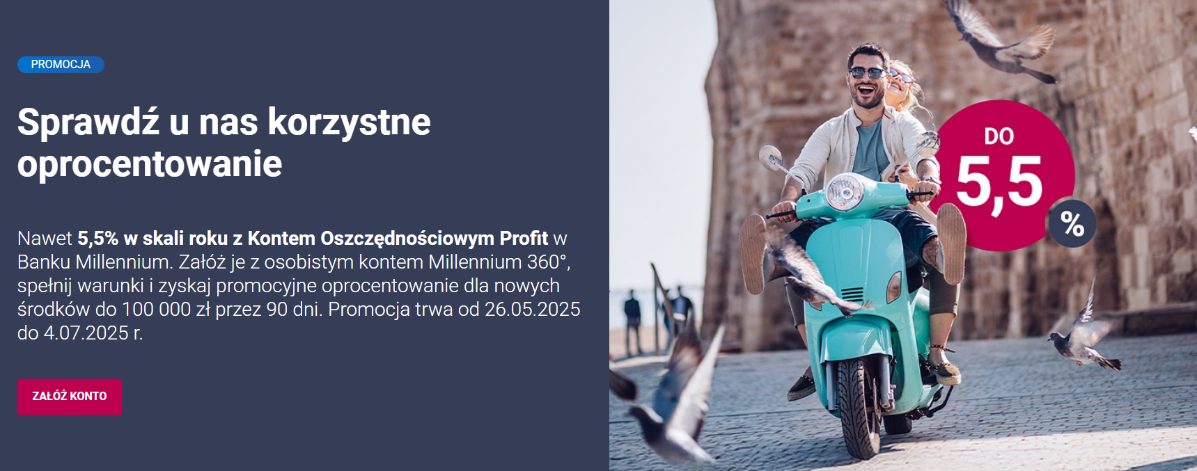 | Konto oszczędnościowe Profit | 5,50% | 90 dni | 100 000,00 zł | Wymaga założenia konta Millennium 360. Promocja trwa do 4 lipca 2025 roku. |