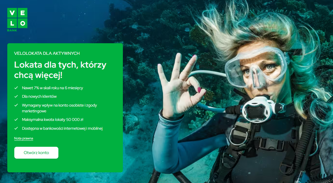 W Velo Bank chętni znajdą dwie ciekawe propozycje. Lokata dla aktywnych zapewnia atrakcyjne oprocentowanie 7,00% na 6 miesięcy dla kwoty do 50 000 zł, ale dostępna jest wyłącznie dla nowych klientów, którzy posiadają konto osobiste z regularnym wpływem co najmniej 2000 zł miesięcznie oraz wyrażą zgody marketingowe. Druga propozycja to Lokata na nowe środki, która oferuje 4,70% na 2 miesiące dla środków do 190 000 zł. W tym przypadku jedynym wymogiem jest wyrażenie zgód marketingowych, co czyni tę ofertę bardziej dostępną, choć z krótszym okresem trwania i niższym oprocentowaniem.
