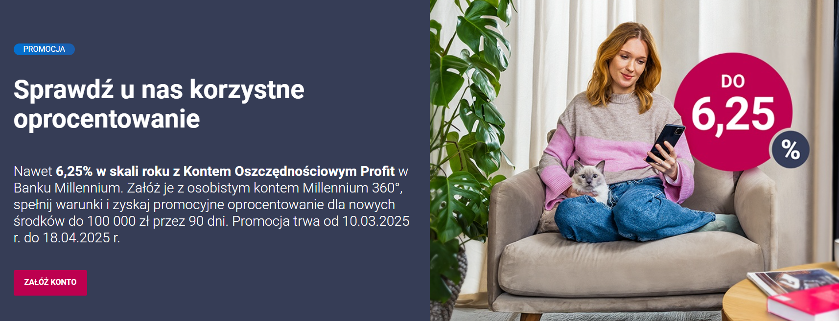 Millennium udostępnia Konto Oszczędnościowe Profit z oprocentowaniem 6,25% na 90 dni. Promocja obowiązuje do 18 kwietnia 2025 roku. Lokata Horyzont Zysku oferuje 4,50% na 6 miesięcy i wymaga spełnienia określonych warunków.