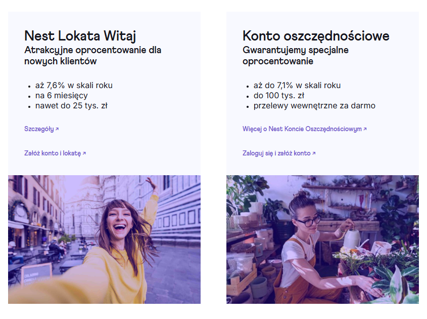 W Nest Banku znajdziemy Lokatę Witaj z oprocentowaniem 7,6% na 6 miesięcy i 5,25% na 3 miesiące. W obu przypadkach wymagane jest wyrażenie zgód marketingowych, a przy wyższej stawce także zapewnienie wpływu wynagrodzenia minimum 2000 zł miesięcznie. Konto oszczędnościowe daje 7,1% przez 90 dni, pod warunkiem aktywnego korzystania z konta. Po tym czasie oprocentowanie spadnie do 2,5%.