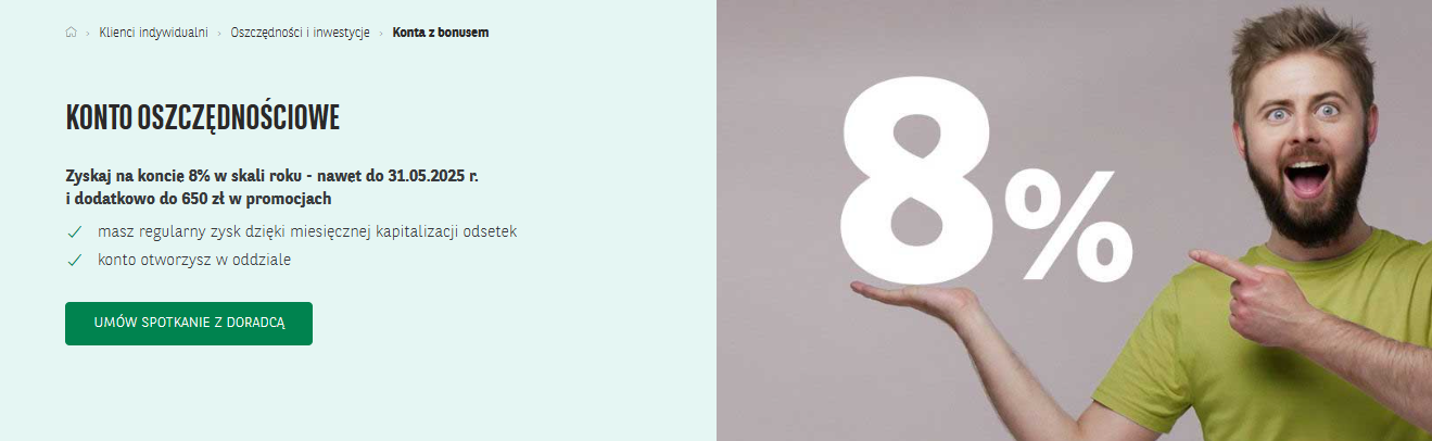 Konto oszczędnościowe oferuje 8% w skali roku, jednak tylko do kwoty 25 000 zł. Promocja obowiązuje do końca maja 2025 roku i wiąże się z dodatkowymi warunkami.