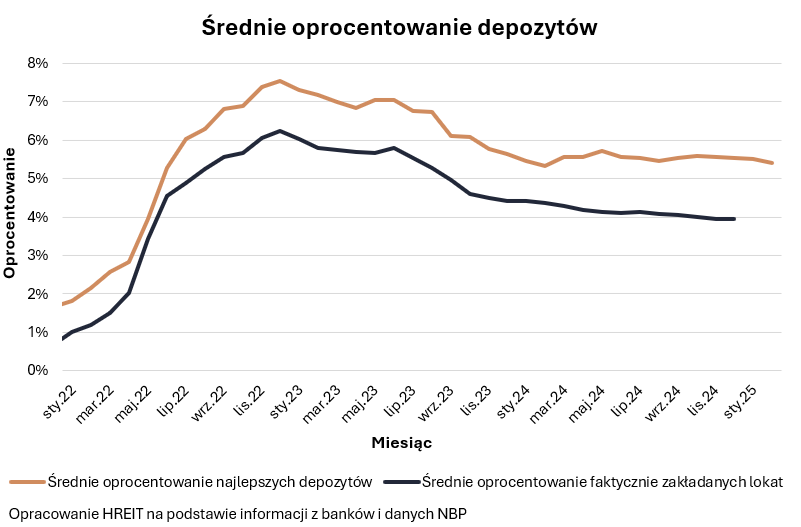 Średnie oprocentowanie najlepszych depozytów wyniosło wynosi około 5,4 proc., a niektóre banki kuszą nawet 7-8 proc. Niestety, rzeczywistość wygląda nieco inaczej, faktycznie oprocentowanie lokat zakładanych w grudniu 2024 r. wyniosło poniżej 4 proc. w skali roku.