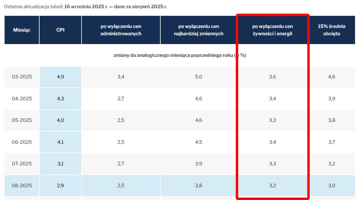 Ponadto inflacja bazowa, czyli po wyłączeniu cen żywności i energii wyniosła w sierpniu 3,2 proc.