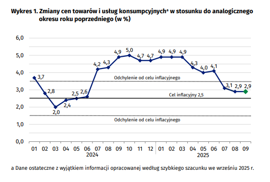 Według wstępnych danych GUS, ceny towarów i usług konsumpcyjnych wzrosły we wrześniu 2025 roku o 2,9 proc. rok do roku. Od lipca inflacja mieści się w granicach celu inflacyjnego NBP.