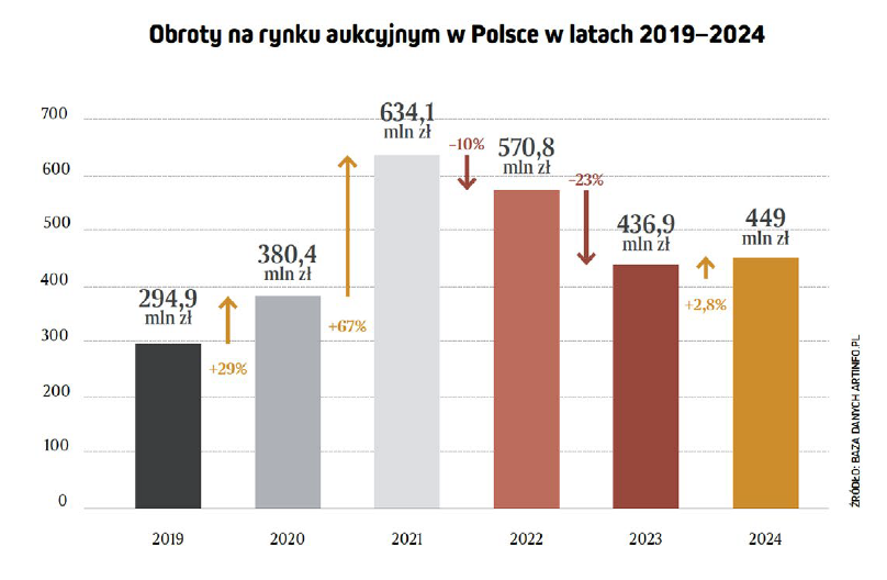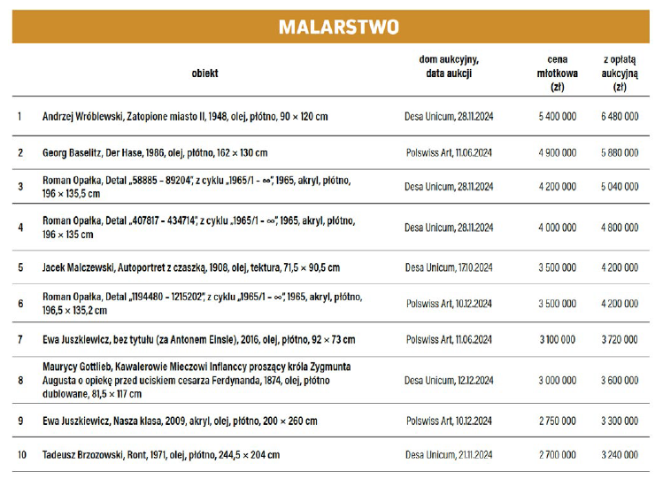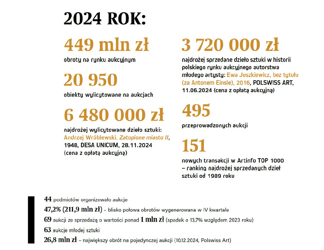 Rok 2024 na polskim rynku aukcyjnym przyniósł odbicie po wcześniejszych spadkach, co widoczne było w rosnących obrotach, mimo utrzymujących się wyzwań w liczbie transakcji i aukcji. Łączna wartość sprzedaży wyniosła 449 mln zł, a na aukcjach wylicytowano 20 950 obiektów. Najdrożej sprzedanym dziełem było „Zatopione miasto II” Andrzeja Wróblewskiego, które osiągnęło cenę 6,48 mln zł. Rekord młodej sztuki ustanowiła Ewa Juszkiewicz z pracą sprzedaną za 3,72 mln zł.